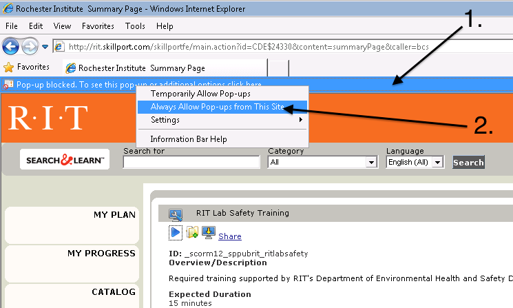 - You will be notified that the Pop-up was blocked. Click the “Options…” button and choose “Allow pop-ups for rit.skillport.com”