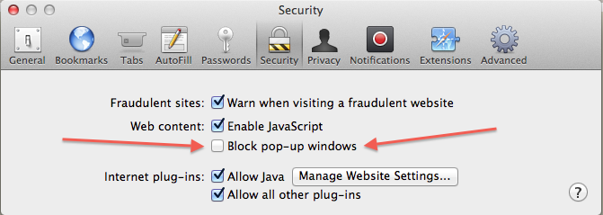 - Choose “Security” and uncheck “Block pop-up windows”